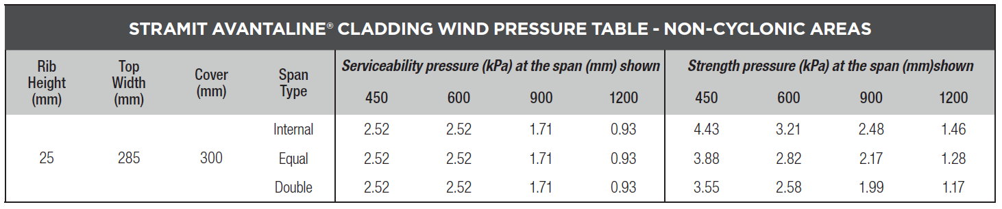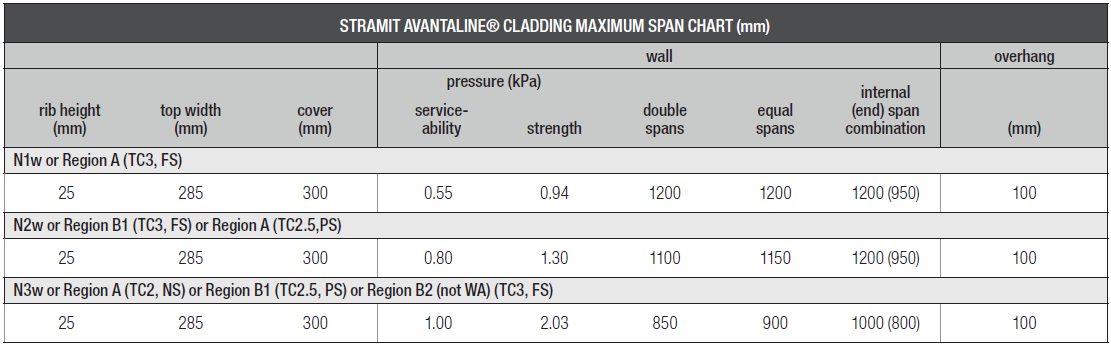 The walling shall be 0.55mm BMT Stramit AvantaLine® cladding in continuous lengths with 25mm high ribs and flat tops spaced at specified centres to suit fixing methods.