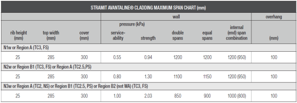 The spans shown below are based on the direct pressure testing method described in the current version of AS1562.1:2018 and take account of wind resistance including local pressure zone effects.