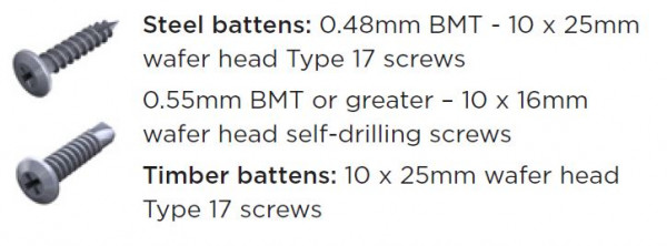 The sheeting shall be fixed to the girts/battens in accordance with the manufacturer’s recommendations. Suitable fixing screws in accordance with Australian Standard AS3566, Class 3, shall be used at every support.