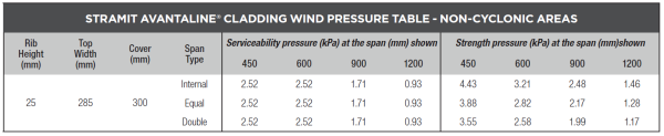 Stramit tests to Australian Standard AS 1562.1:2018 called up in the National Construction Code to provide wind pressure tables.