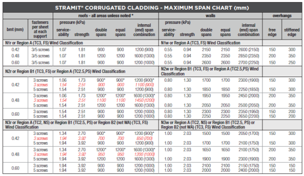 The spans shown below take account of 'normal' foot traffic and wind resistance including local pressure zone effects. Pressures are based on AS 4055:2021 or AS/NZS 1170.2:2021.