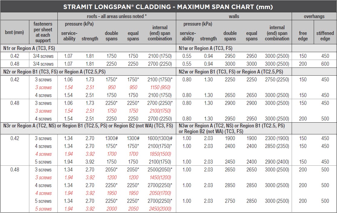 Tables are based on testing to AS 1562.1:2018 and AS 4040 parts 0 and 2. Internal spans must have both end spans 20% shorter. Values only valid for use with steel support members of 1.5mm or thicker. Where thinner supports are used, fastener capacity must be checked. For use with battens supports on roofs, refer to Stramit® Top Hat and Batten Product Technical Supplement. Refer to Stramit® Cyclonic Areas Roof and Wall Cladding Brochure for information on use in Cyclonic Regions.