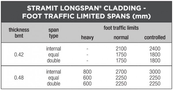 Foot traffic limits for Stramit Longspan® Roof and Wall Cladding are shown for 3 alternative foot traffic categories: