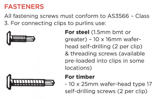 Stramit® Speed Deck 500 Concealed Fixed Decking has purpose made fixing clips to attach the decking to the purlins. These clips require 2 fasteners positioned between the clip upstands.