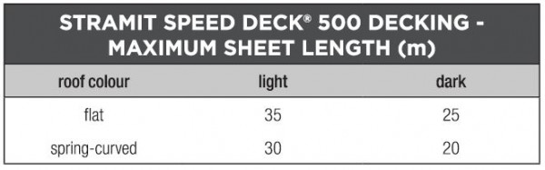 Stramit Speed Deck® 500 Concealed Fixed Decking has excellent resistance to the problems associated with thermal expansion. Nevertheless sheet lengths should be limited as follows.