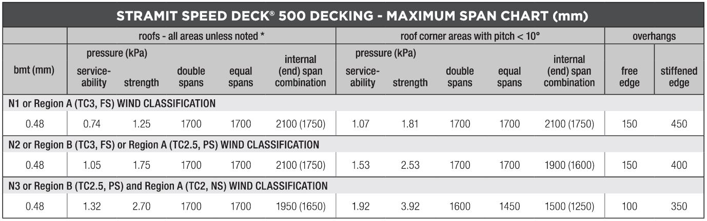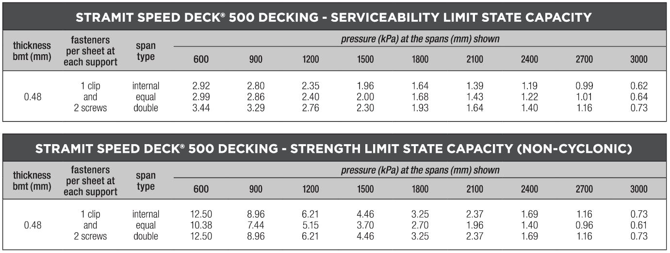 Particular attention is drawn to maintaining an adequate roof slope for snow shedding, and screw fixing of deck pans beneath the ridge capping. Downward load capacities for Stramit Speed Deck® 500 Concealed Fixed Decking have not been tabulated, but can be assumed to equal the outward capacities shown.