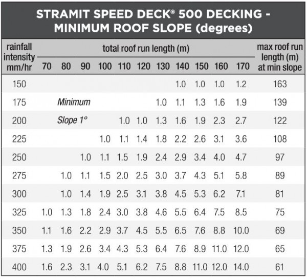 Stramit Speed Deck® 500 Concealed Fixed Decking has excellent water carrying capacity. This and the decking stiffness enable roof slopes to be as low as one degree for many applications. Roof run lengths are the combined lengths of all roof elements contributing to a single pan drainage path. This can include the roof length upstream of a roof penetration that concentrates flow into other pans.