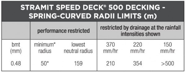 Stramit Speed Deck® 500 Concealed Fixed Decking can be spring curved, concave and convex, including curved ridges, provided it is within the recommended limits below.
